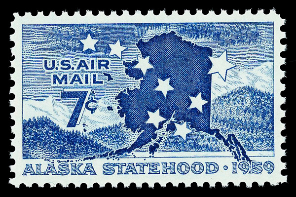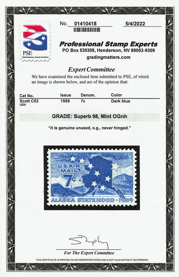 5750 nh C53 imageAirmail, 1959, 7¢ Alaska Statehood (Scott C53), o.g., never hinged, Superb, with 2022 P.S.E. certificate graded SUP 98.
