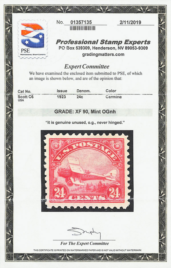 5730 nh C6 imageAirmail, 1923, 24¢ carmine (Scott C6), o.g., never hinged, Extremely Fine, with 2019 P.S.E. certificate graded XF 90.