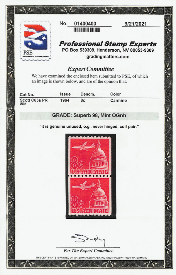 5751 nh C65a imageAirmail, 1962, 8¢ Jet & Capitol coil, tagged (Scott C65a), pair, o.g., never hinged, Superb, with 2021 P.S.E. certificate graded SUP 98.