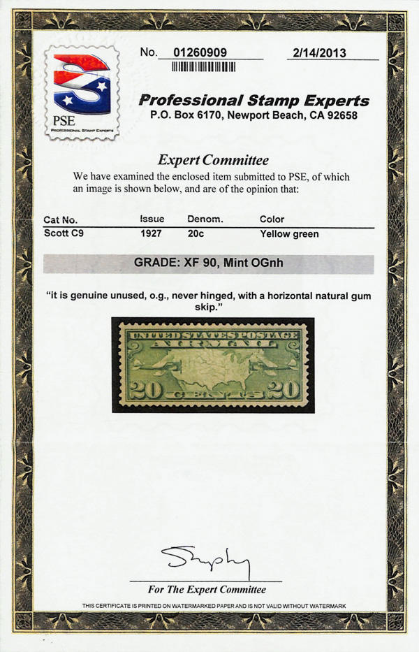 5731 nh C9 imageAirmail, 1927, 20¢ Map & Planes (Scott C9), o.g., never hinged (gum skip), Extremely Fine, with 2013 P.S.E. certificate graded XF 90.