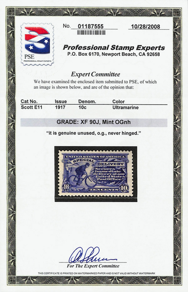 5758 nh E11 imageSpecial Delivery, 1917, 10¢ ultramarine (Scott E11), o.g., never hinged, jumbo margins, Extremely Fine, with 2008 P.S.E. certificate graded XF 90J.