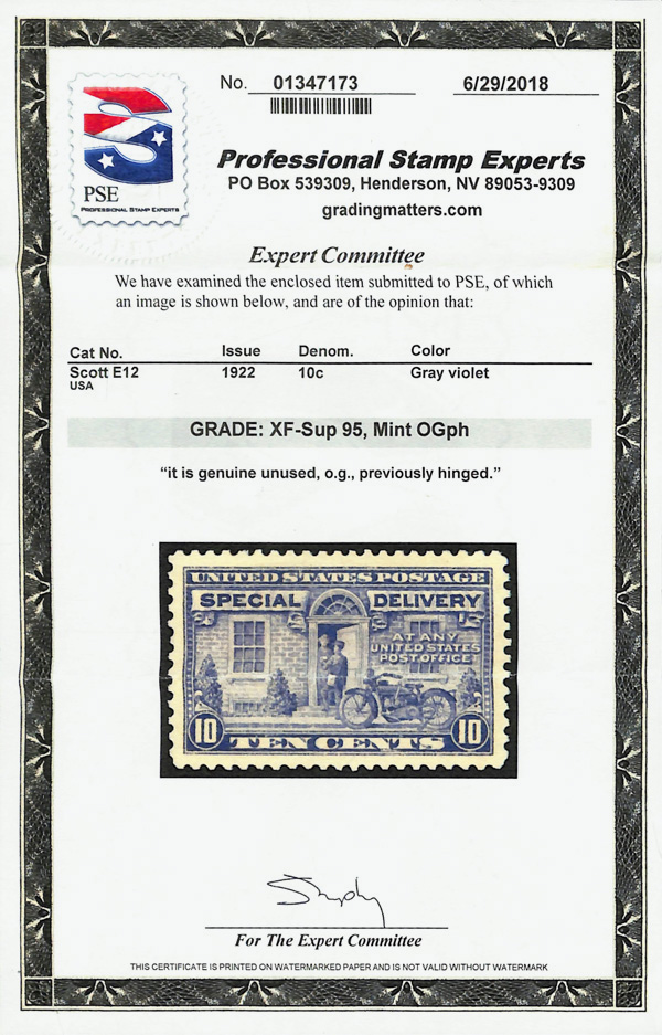 5759 og E12 imageSpecial Delivery, 1922, 10¢ gray violet (Scott E12), o.g., barest trace of hinge (appears never hinged), Extremely Fine to Superb, with 2018 P.S.E. certificate graded XF-SUP 95.