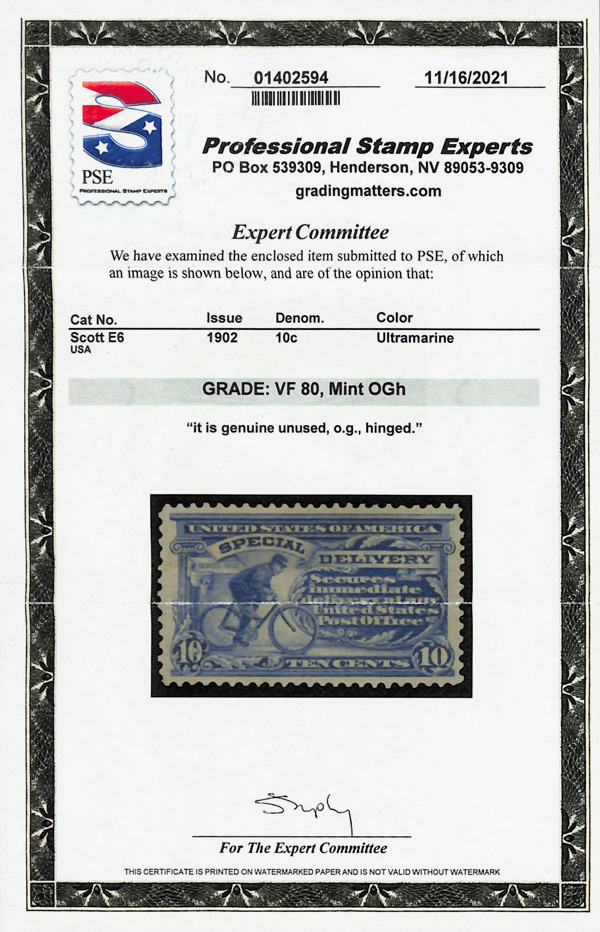 5757 og E6 imageSpecial Delivery, 1902, 10¢ ultramarine (Scott E6), o.g., hinged, Very Fine, with 2021 P.S.E. certificate graded VF 80.