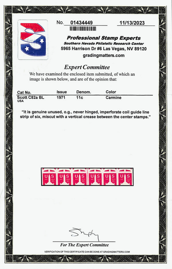 5752 nh C82a imageAirmail, 1971, 11¢ Jet coil, imperf. pair (Scott C82a), miscut, o.g., never hinged, Extremely Fine, less than 200 pairs issued, with 2023 P.S.E. certificate.