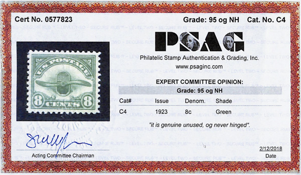 5728 nh C4 imageAirmail, 1923, 8¢ dark green (Scott C4), o.g., never hinged, Extremely Fine to Superb, with 2018 P.S.A.G. certificate graded XF-SUP 95.