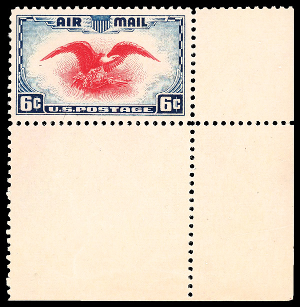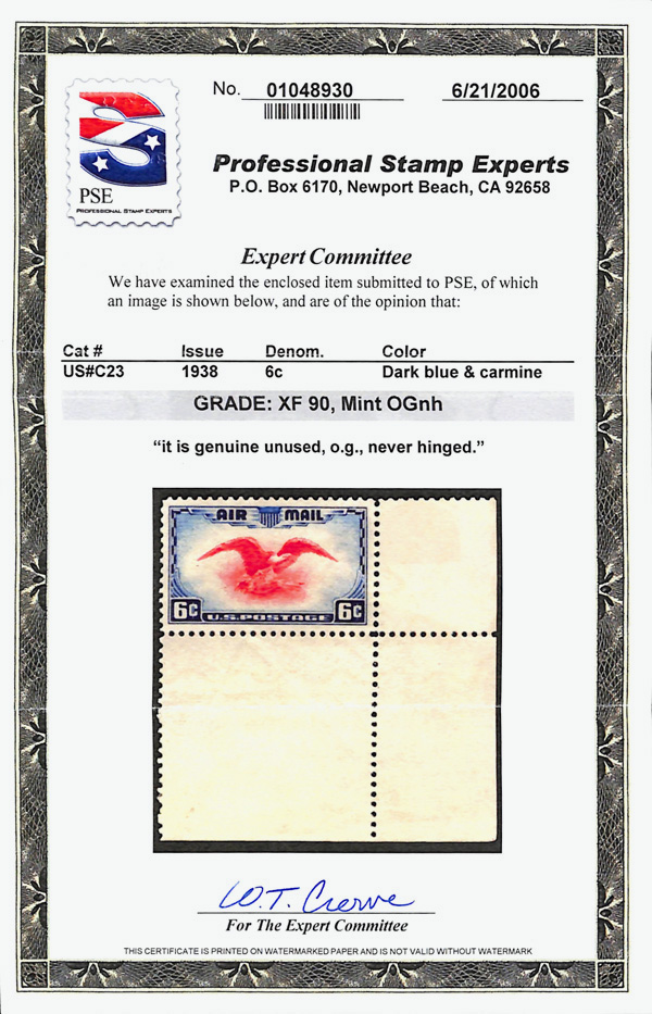 5740 nh C23 imageAirmail, 1938, 6¢ Eagle (Scott C23), corner margin single, o.g., never hinged, Extremely Fine, with 2006 P.S.E. certificate graded XF 90.