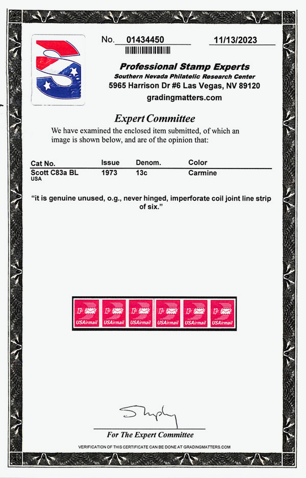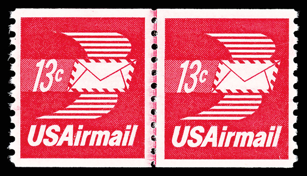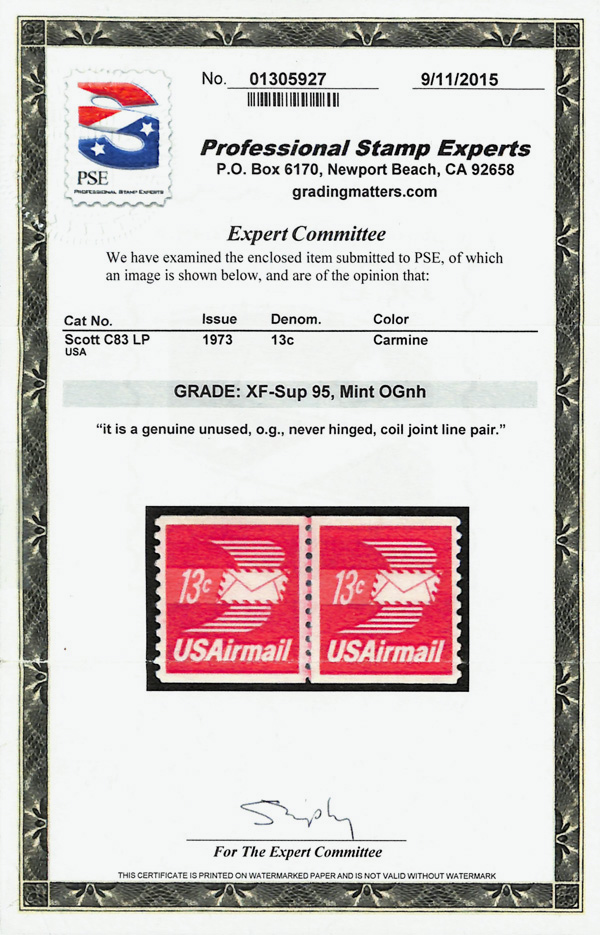5754 nh C83 imageAirmail, 1973, 13¢ Winged Envelope coil (Scott C83), joint line pair, o.g., never hinged, eye-catchingly bold, fresh and margined, Extremely Fine to Superb, with 2015 P.S.E. certificate graded XF-SUP 95.