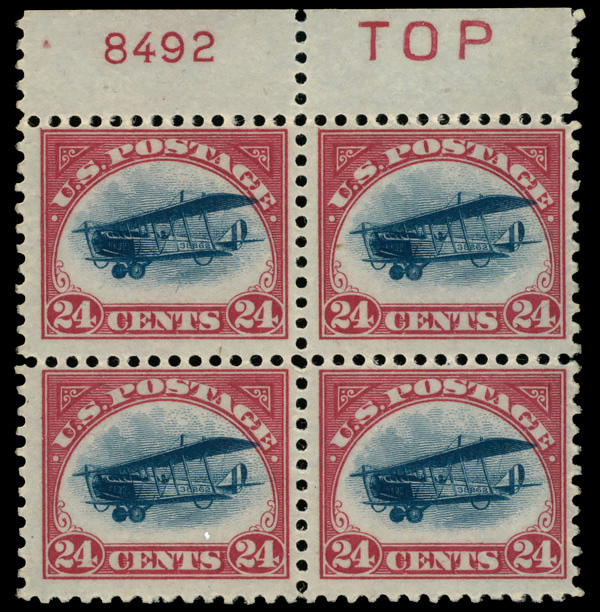 5727 nhbl C3 imageAirmail, 1918, 24¢ carmine rose & blue (Scott C3), top margin block of 4 with plate number & red 'TOP', o.g., never hinged (minor gum skips), Fine.