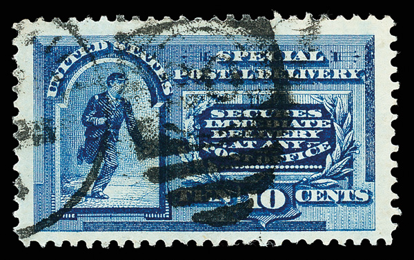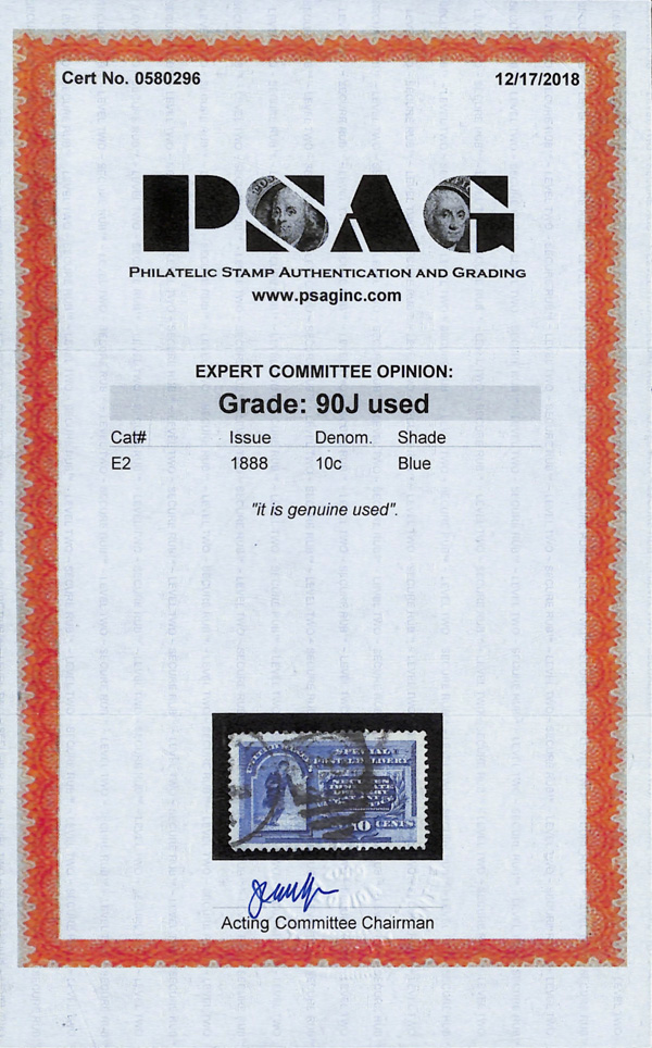 5756 O E2 imageSpecial Delivery, 1888, 10¢ blue (Scott E2), a pristine jumbo with rich color and superior centering; duplex cancel, Extremely Fine, with 2018 P.S.A.G. certificate graded XF 90J.