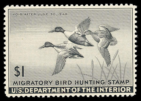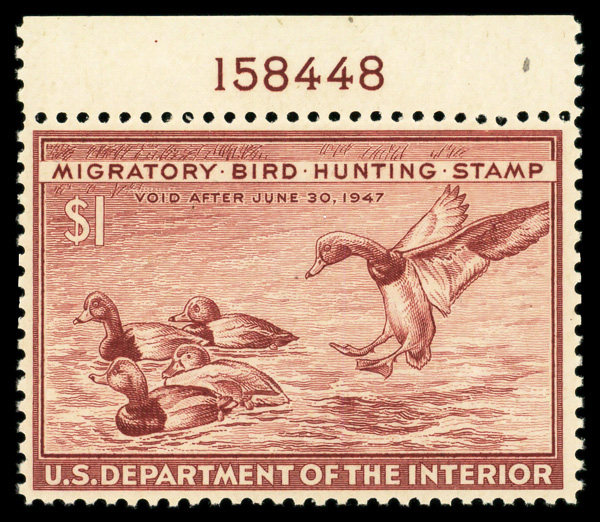5849 nh RW13 imageFederal Duck Stamp, 1946, $1 Redhead Ducks (Scott RW13), plate number single, o.g., never hinged, Very Fine.