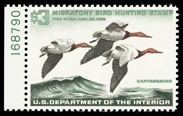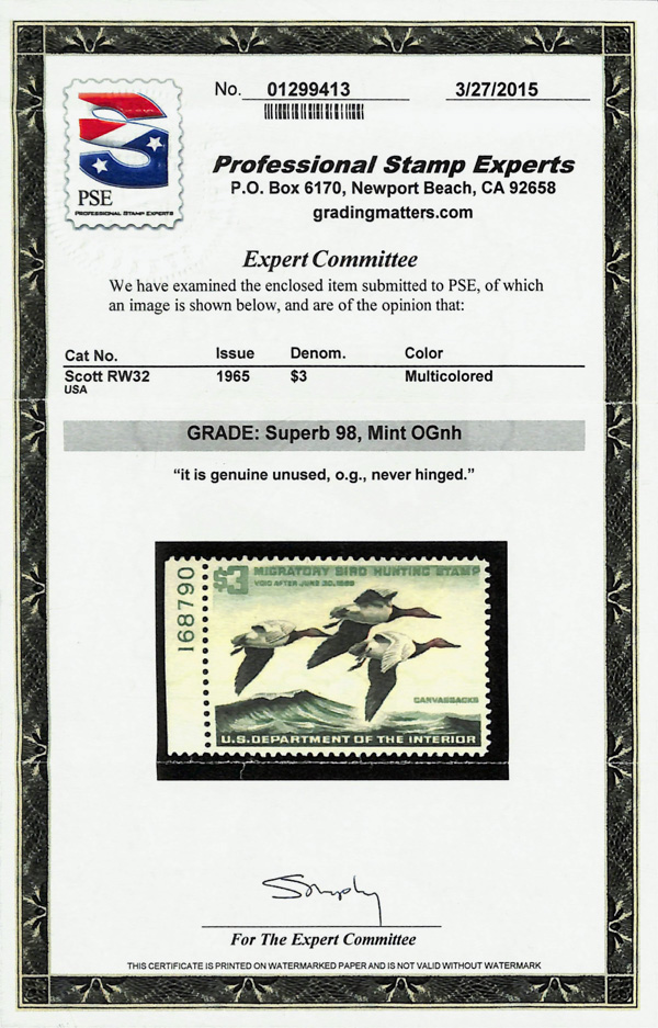 5867 nh RW32 imageFederal Duck Stamp, 1965, $3 Canvasback Drakes (Scott RW32), plate number single, o.g., never hinged, Superb, with 2015 P.S.E. certificate graded SUP 98.