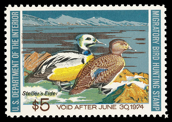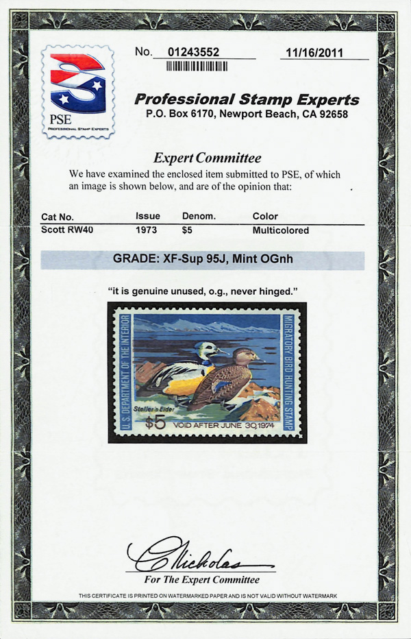5873 nh RW40 imageFederal Duck Stamp, 1973, $5 Steller's Eiders (Scott RW40), o.g., never hinged, jumbo margins, Extremely Fine to Superb, with 2011 P.S.E. certificate graded XF-SUP 95J.