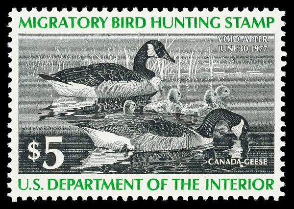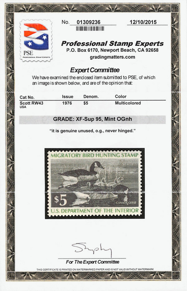 5874 nh RW43 imageFederal Duck Stamp, 1976, $5 Canada Geese (Scott RW43), o.g., never hinged, Extremely Fine to Superb, with 2015 P.S.E. certificate graded XF-SUP 95.