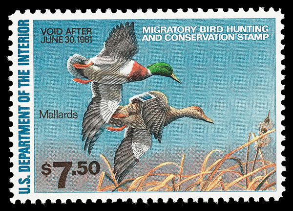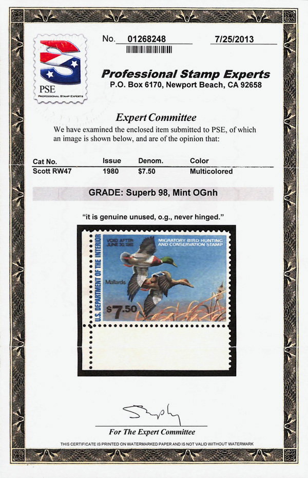 5876 nh RW47 imageFederal Duck Stamp, 1980, $7.50 Mallards (Scott RW47), o.g., never hinged, Superb, with 2013 P.S.E. certificate graded SUP 98.