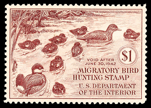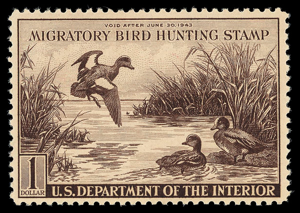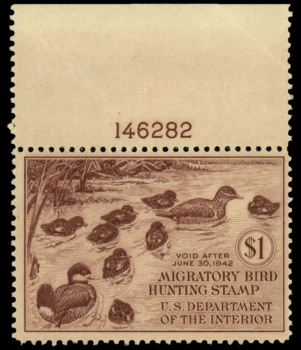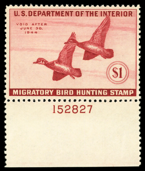 5846 nh RW10 imageFederal Duck Stamp, 1943, $1 Wood Ducks (Scott RW10), plate number single, o.g., never hinged, Very Fine.