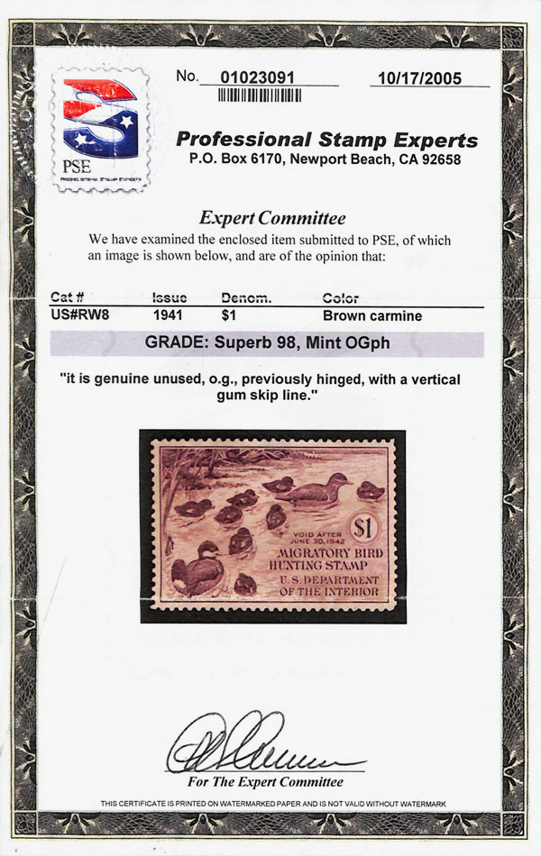 5844 og RW8 imageFederal Duck Stamp, 1941, $1 Ruddy Ducks (Scott RW8), o.g., very lightly hinged (gum skip), Superb no SMQ price, with 2005 P.S.E. certificate graded SUP 98. (Image) (Image2) (All Images)