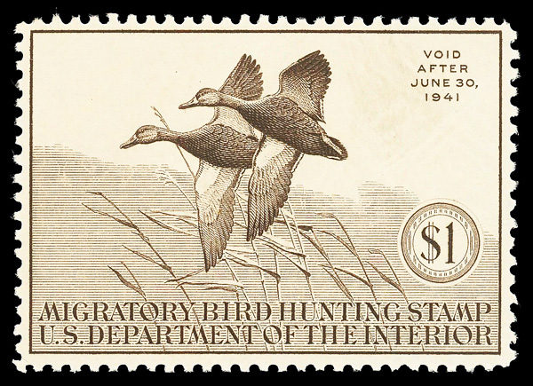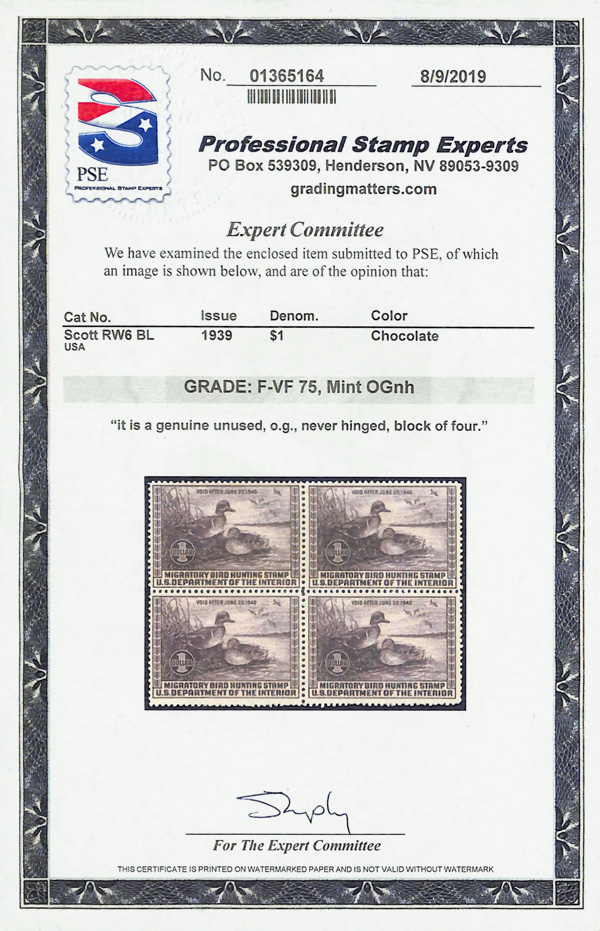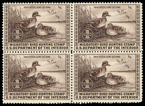 5841 nhbl RW6 imageFederal Duck Stamp, 1939, $1 Green-winged Teals (Scott RW6), block of 4, o.g., never hinged, Fine to Very Fine, with 2019 P.S.E. certificate graded F-VF 75.