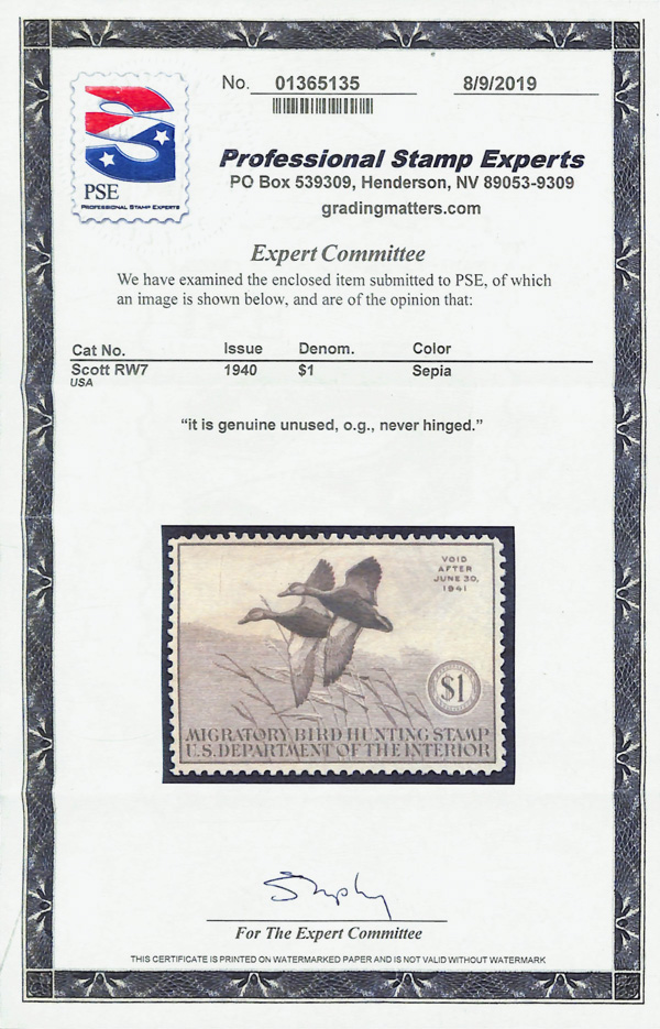 5842 nh RW7 imageFederal Duck Stamp, 1940, $1 Black Mallards (Scott RW7), o.g., never hinged, Fine to Very Fine, with 2019 P.S.E. certificate.