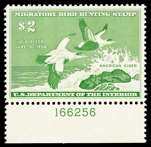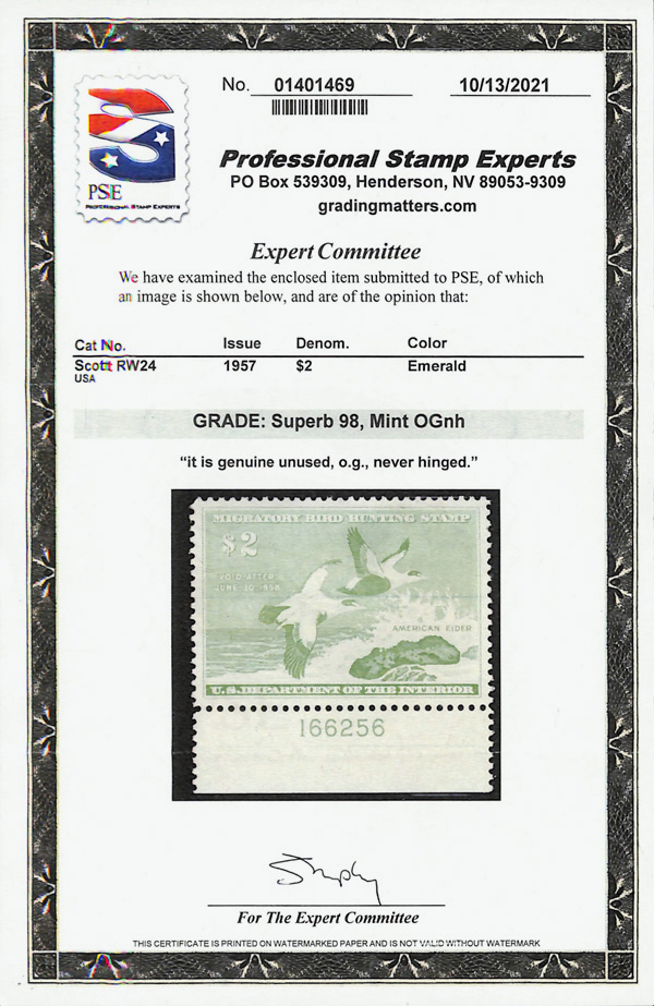 5858 nh RW24 imageFederal Duck Stamp, 1957, $2 American Eider (Scott RW24), plate number single, o.g., never hinged, Superb, with 2021 P.S.E. certificate graded SUP 98.