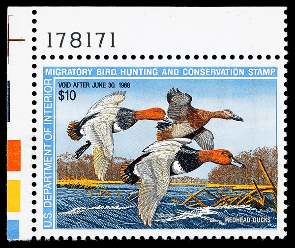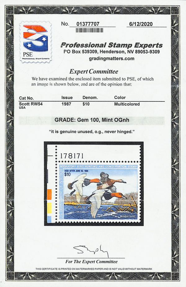 5879 nh RW54 imageFederal Duck Stamp, 1987, $10 Redhead Ducks (Scott RW54), plate number single, o.g., never hinged, Superb, with 2020 P.S.E. certificate graded GEM 100.