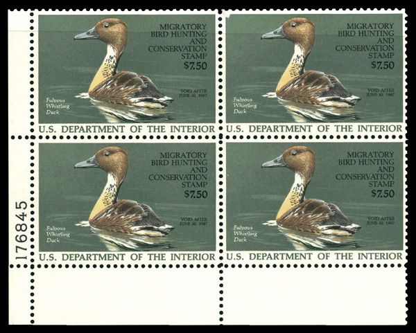5878 nhbl RW53 imageFederal Duck Stamp, 1986, $7.50 Fulvous Whistling Duck (Scott RW53), plate block of 4, o.g., never hinged, Extremely Fine.