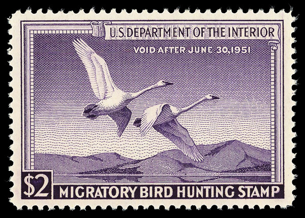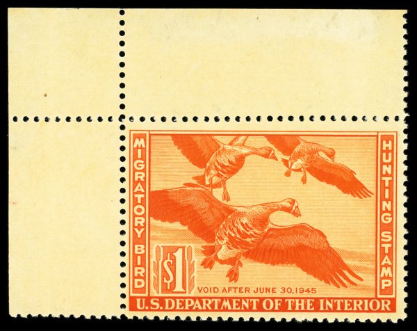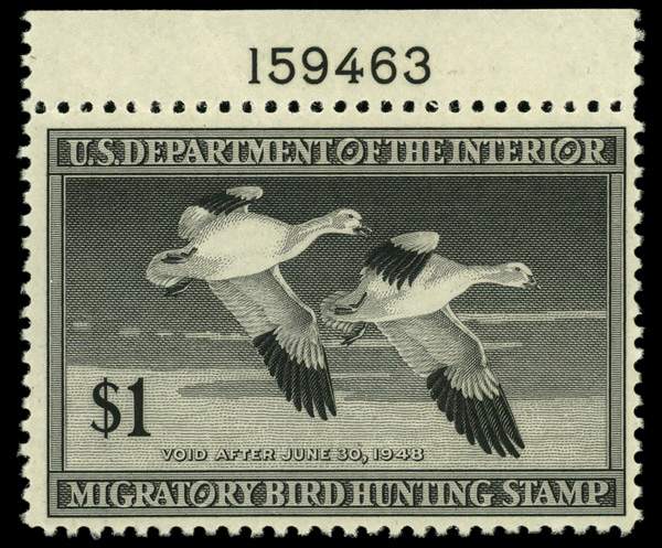 5850 nh RW14 imageFederal Duck Stamp, 1947, $1 Snow Geese (Scott RW14), plate number single, o.g., never hinged (gum skip), Fine to Very Fine.