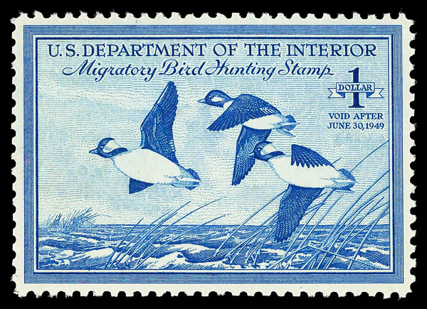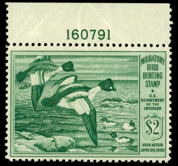 5852 nh RW16 imageFederal Duck Stamp, 1949, $2 Goldeneye Ducks (Scott RW16), plate number single, o.g., never hinged (gum creases), Fine to Very Fine.