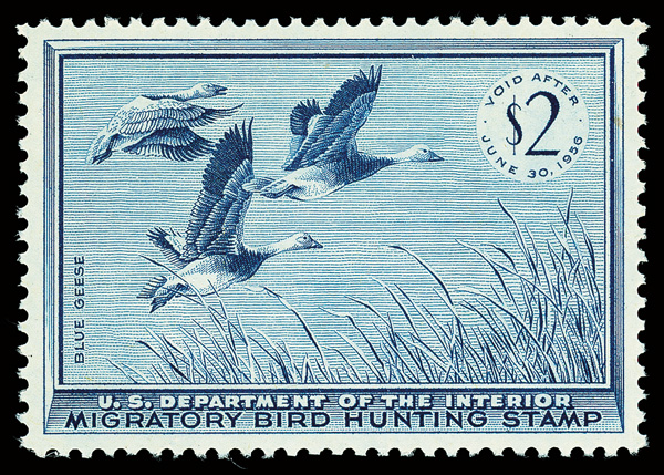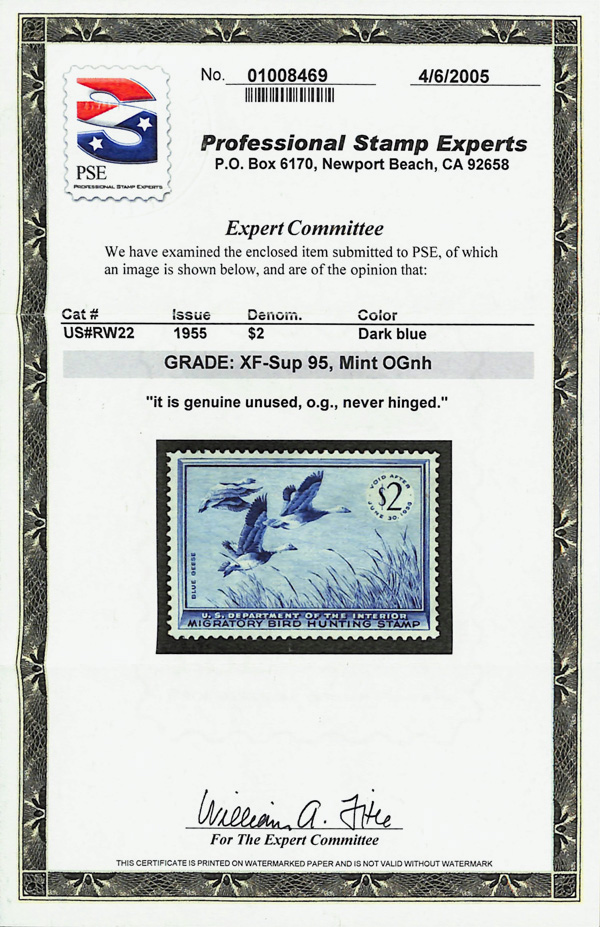 5856 nh RW22 imageFederal Duck Stamp, 1955, $2 Blue Geese (Scott RW22), o.g., never hinged, Extremely Fine to Superb, with 2005 P.S.E. certificate graded XF-SUP 95.