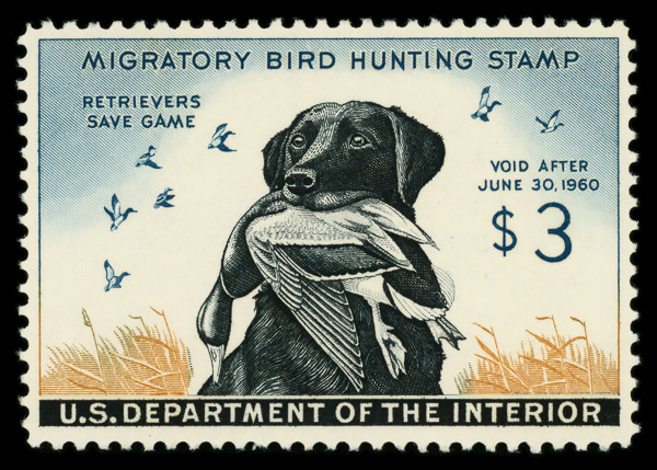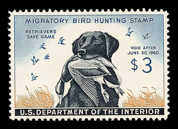 5860 nh RW26 imageFederal Duck Stamp, 1959, $3 Labrador Retriever (Scott RW26), o.g., never hinged, Very Fine to Extremely Fine.