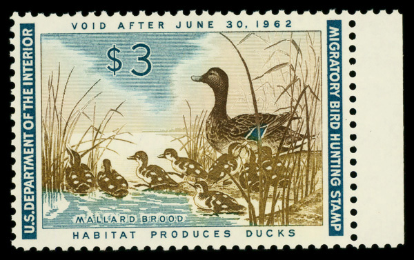 5863 nh RW28 imageFederal Duck Stamp, 1961, $3 Mallards (Scott RW28), o.g., never hinged, Extremely Fine.
