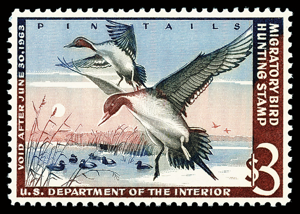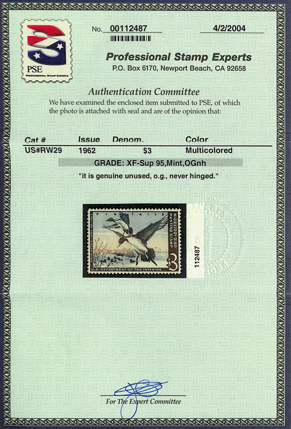 5864 nh RW29 imageFederal Duck Stamp, 1962, $3 Pintail Drakes (Scott RW29), o.g., never hinged, Extremely Fine to Superb, with 2004 P.S.E. certificate graded XF-SUP 95.