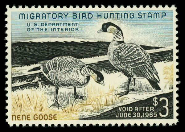 5866 nh RW31 imageFederal Duck Stamp, 1964, $3 Nene Geese (Scott RW31), o.g., never hinged, Very Fine.