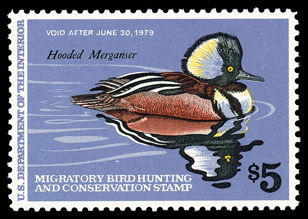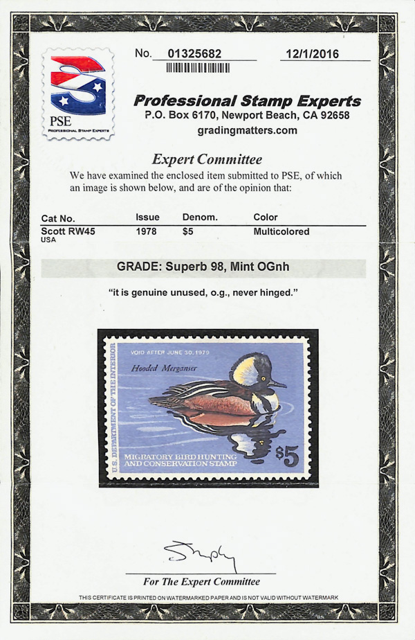 5875 nh RW45 imageFederal Duck Stamp, 1978, $5 Hooded Merganser (Scott RW45), o.g., never hinged, Superb, with 2016 P.S.E. certificate graded SUP 98.