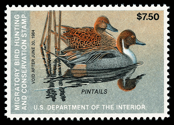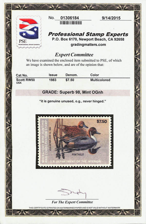 5877 nh RW50 imageFederal Duck Stamp, 1983, $7.50 Pintails (Scott RW50), o.g., never hinged, Superb, with 2015 P.S.E. certificate graded SUP 98.