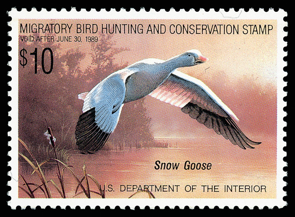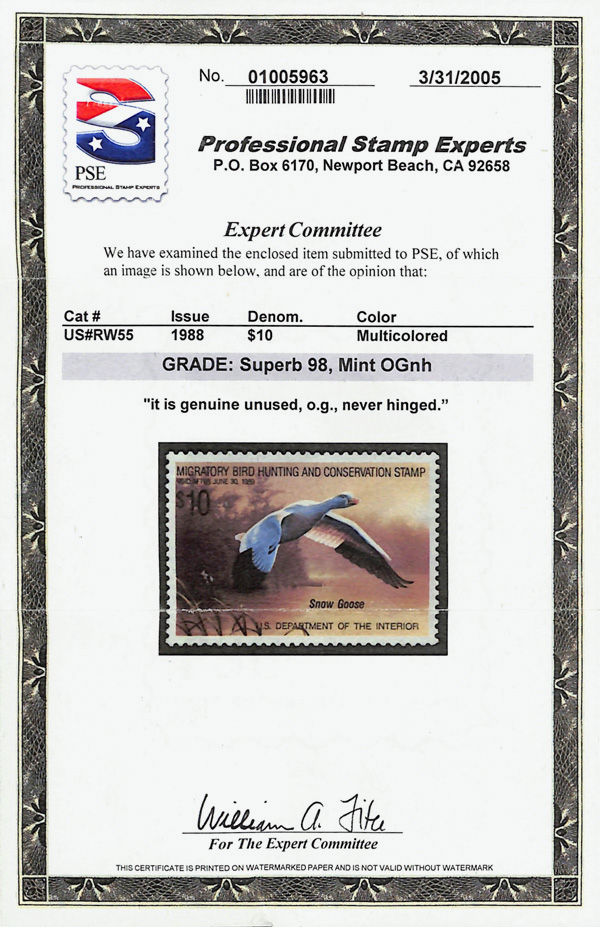 5880 nh RW55 imageFederal Duck Stamp, 1988, $10 Snow Geese (Scott RW55), o.g., never hinged, Superb, with 2005 P.S.E. certificate graded SUP 98.