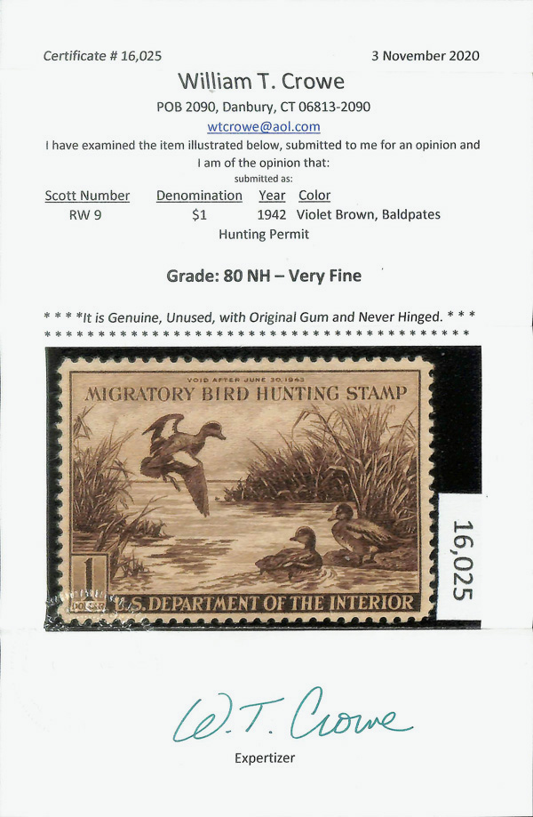 5845 nh RW9 imageFederal Duck Stamp, 1942, $1 Baldpates (Scott RW9), o.g., never hinged, Very Fine, with 2020 Crowe certificate graded VF 80.