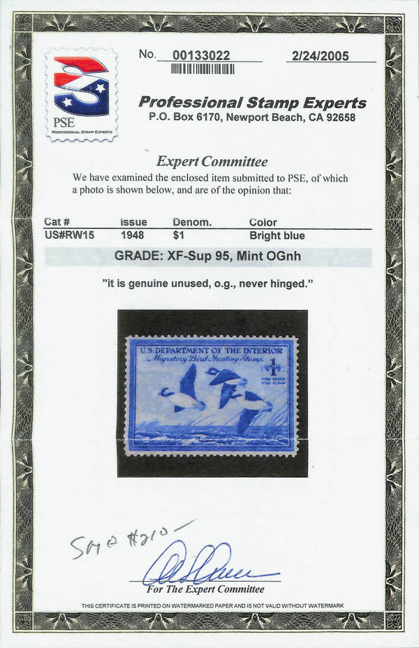 5851 nh RW15 imageFederal Duck Stamp, 1948, $1 Buffleheads (Scott RW15), o.g., never hinged, Extremely Fine to Superb, with 2005 P.S.E. certificate graded XF-SUP 95.