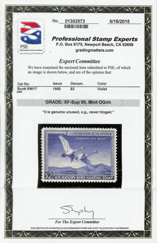 5853 nh RW17 imageFederal Duck Stamp, 1950, $2 Trumpeter Swans (Scott RW17), o.g., never hinged, Extremely Fine to Superb, with 2015 P.S.E. certificate graded XF-SUP 95.
