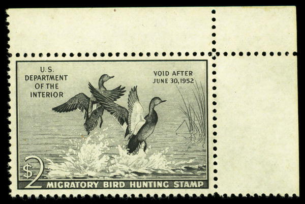 5854 nh RW18 imageFederal Duck Stamp, 1951, $2 Gadwall Ducks (Scott RW18), corner margin single, o.g., never hinged, Very Fine to Extremely Fine.