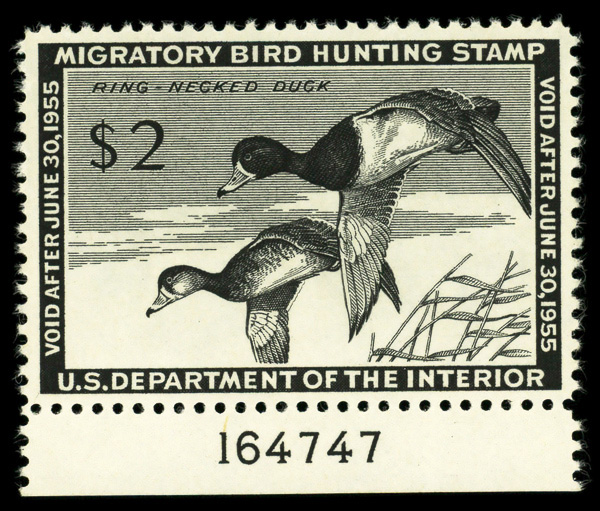 5855 nh RW21 imageFederal Duck Stamp, 1954, $2 Ring-necked Ducks (Scott RW21), plate number single, o.g., never hinged, Extremely Fine.