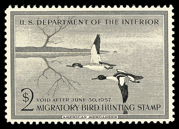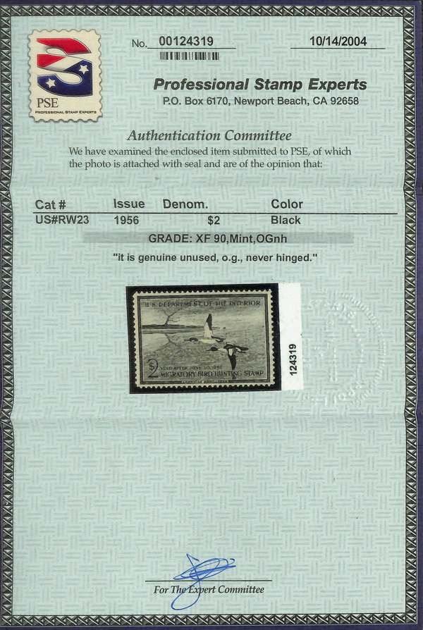 5857 nh RW23 imageFederal Duck Stamp, 1956, $2 American Merganser (Scott RW23), o.g., never hinged, Extremely Fine, with 2004 P.S.E. certificate graded XF 90.