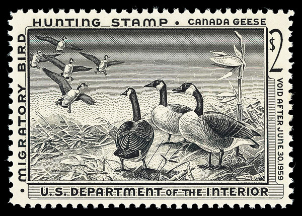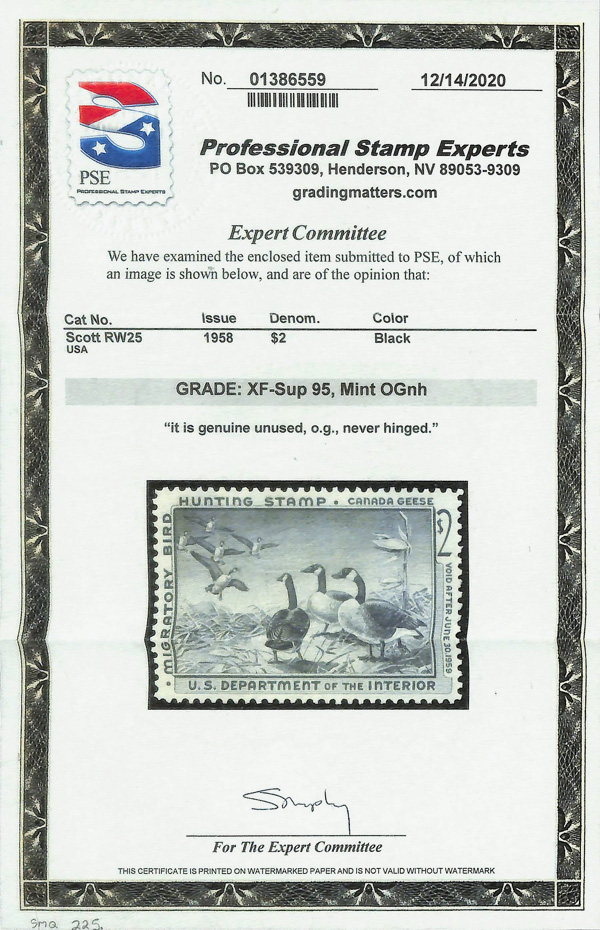 5859 nh RW25 imageFederal Duck Stamp, 1958, $2 Canada Geese (Scott RW25), o.g., never hinged, Extremely Fine to Superb, with 2020 P.S.E. certificate graded XF-SUP 95.