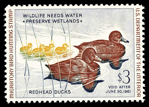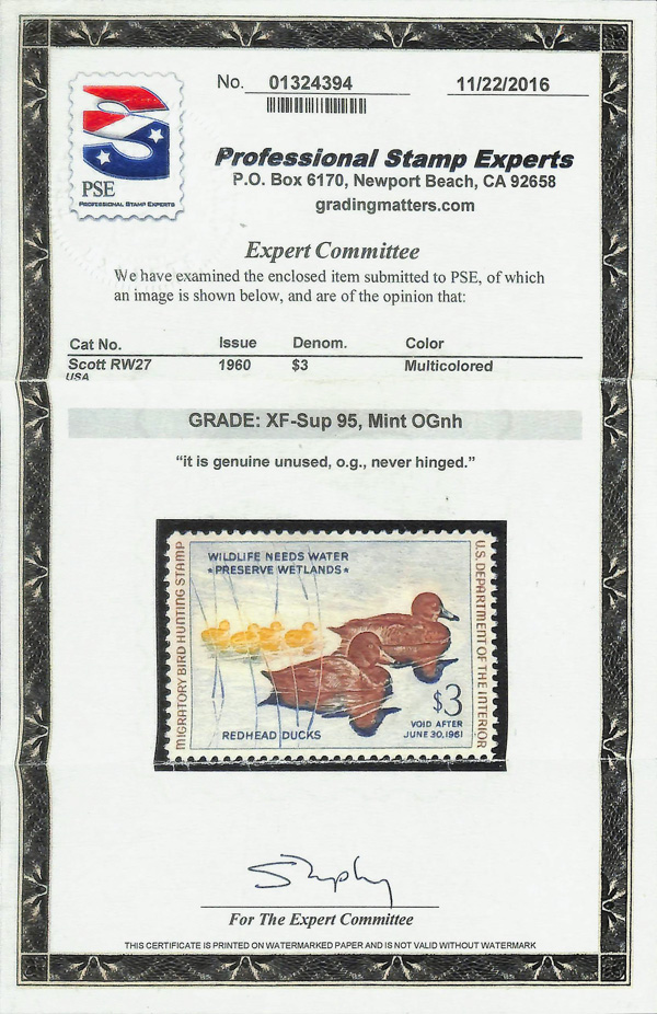 5862 nh RW27 imageFederal Duck Stamp, 1960, $3 Redhead Ducks (Scott RW27), o.g., never hinged, Extremely Fine to Superb, with 2016 P.S.E. certificate graded XF-SUP 95.