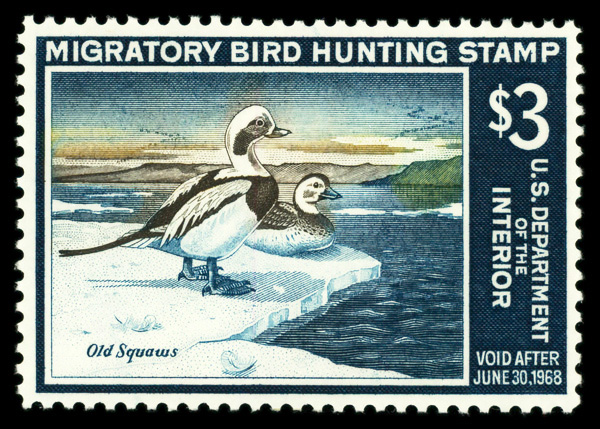 5869 nh RW34 imageFederal Duck Stamp, 1967, $3 Old Squaw Ducks (Scott RW34), o.g., never hinged, Very Fine to Extremely Fine.