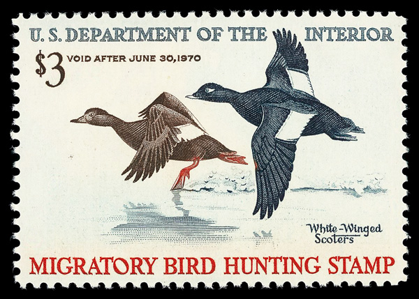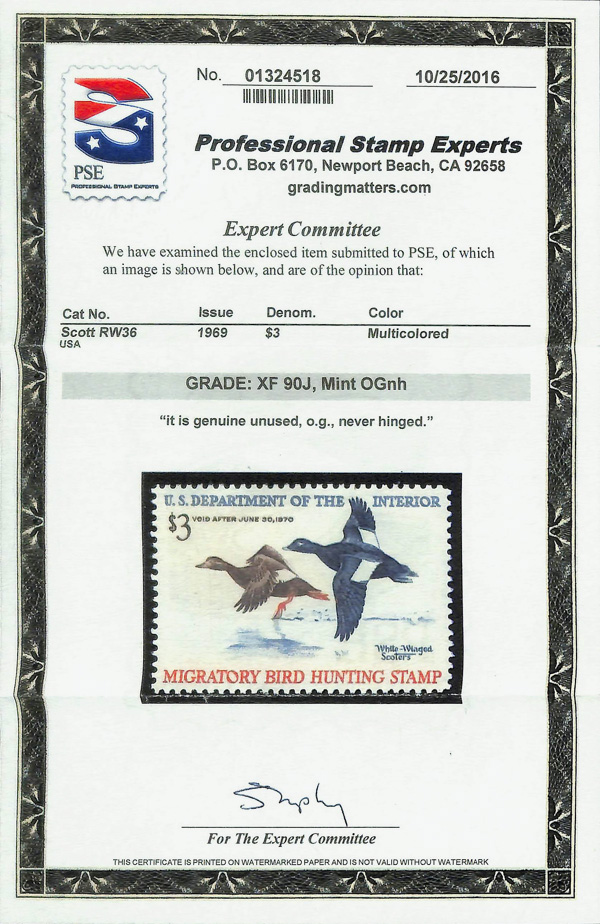 5870 nh RW36 imageFederal Duck Stamp, 1969, $3 White-Winged Scoters (Scott RW36), o.g., never hinged, jumbo margins, Extremely Fine, with 2016 P.S.E. certificate graded XF 90J.