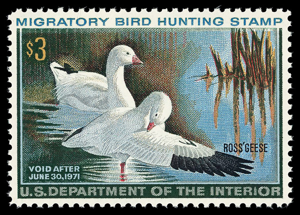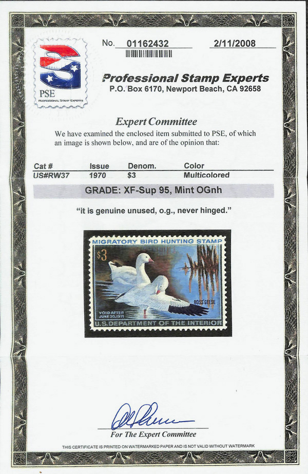 5871 nh RW37 imageFederal Duck Stamp, 1970, $3 Ross's Geese (Scott RW37), o.g., never hinged, Extremely Fine to Superb, with 2008 P.S.E. certificate graded XF-SUP 95.