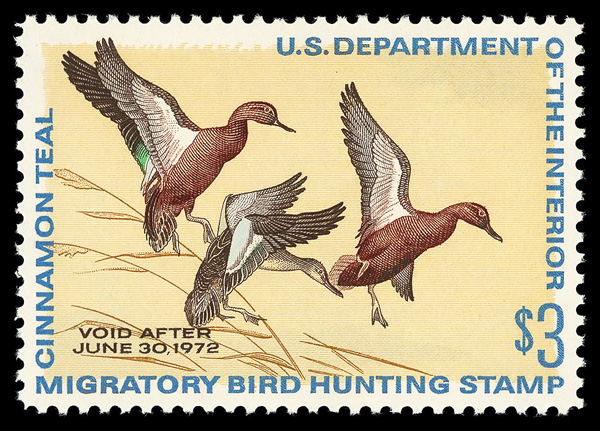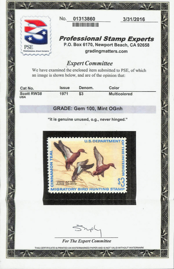 5872 nh RW38 imageFederal Duck Stamp, 1971, $3 Cinnamon Teals (Scott RW38), o.g., never hinged, Superb, with 2016 P.S.E. certificate graded GEM 100.