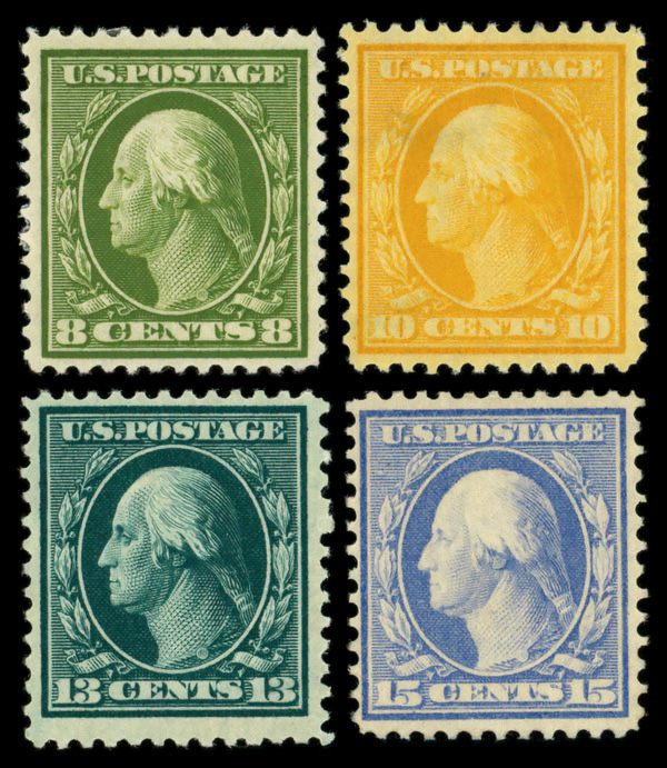 5180 og 337-340 image1908, 8¢, 10¢, 13¢ & 15¢ Washington, D.L. watermark, perf 12 (Scott 337-340), o.g., hinged, Fine to Very Fine.