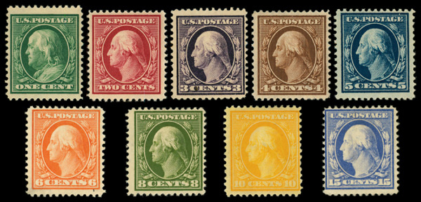 5196 og 374-382 image1910-11, Washington-Franklins, S.L. watermark, 1¢ to 15¢ complete (Scott 374-382), o.g., hinged, Fine to Very Fine.