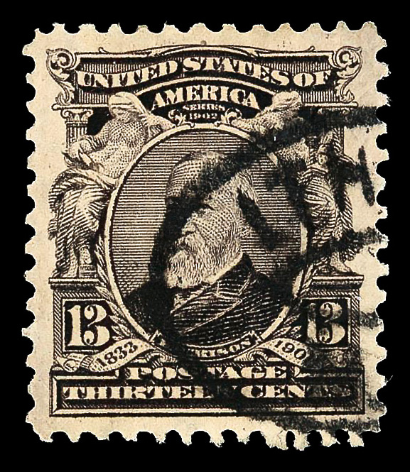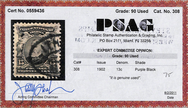 5161 O 308 image1902, 13¢ purple black (Scott 308), Extremely Fine, with 2011 P.S.A.G. certificate graded XF 90.